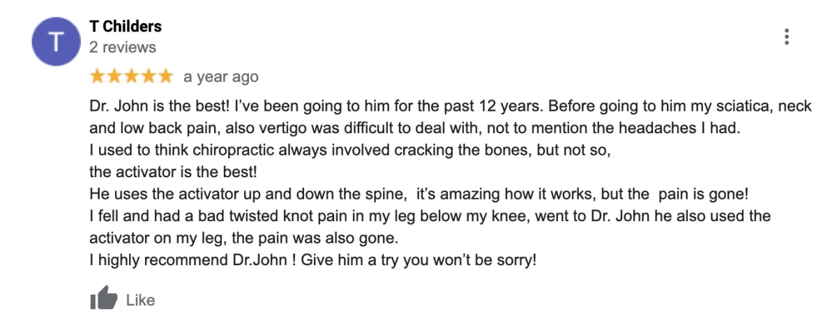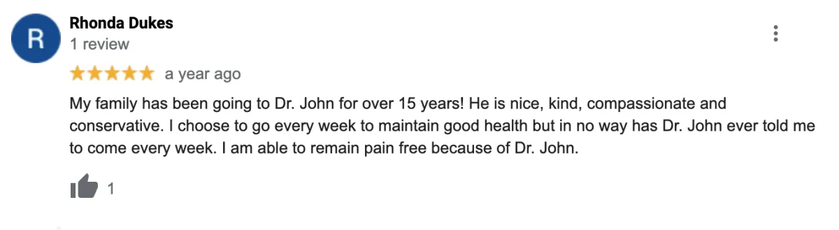 Dr. John routinely attends post-graduate programs in various chiropractic techniques, diagnosis, imaging, nutrition and general wellness. He is also a past board member, chairperson and treasurer for The Friends of the Guardian ad Litem,